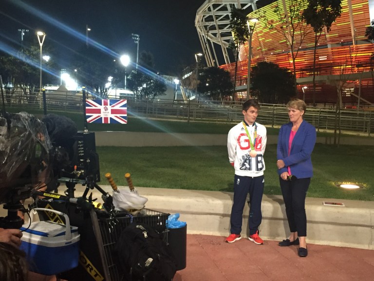 4. Olympic Park: Since I had a fencing ticket, I ventured into Olympic Park for the first time today. I prefer the one in Sochi, which just looked nicer, and had the ACTUAL BURNING TORCH right in the center of it. Like I mentioned before, I just don’t feel like there’s any sort of vibe. At the back of the park, there was this “festival” area with a few stages and the Coke, Nissan, Claro, and Bradesco pavilions. The SKOL (local beer brand) House was like a club with a couple of bars, DJ, and a dance floor. Very cool-looking. On the way out, I spotted a Team GB bronze medal winner getting interviewed by British Olympic TV.