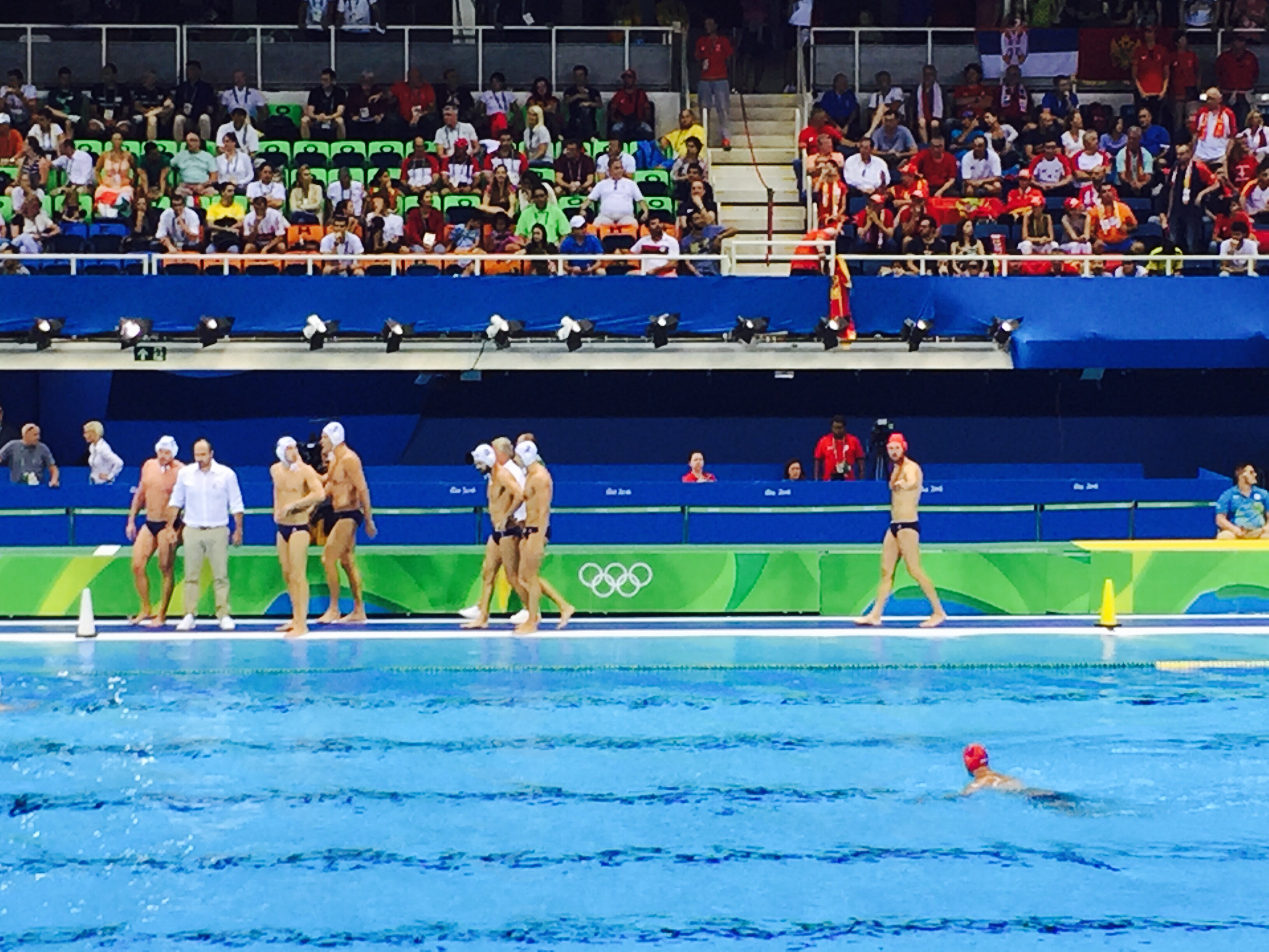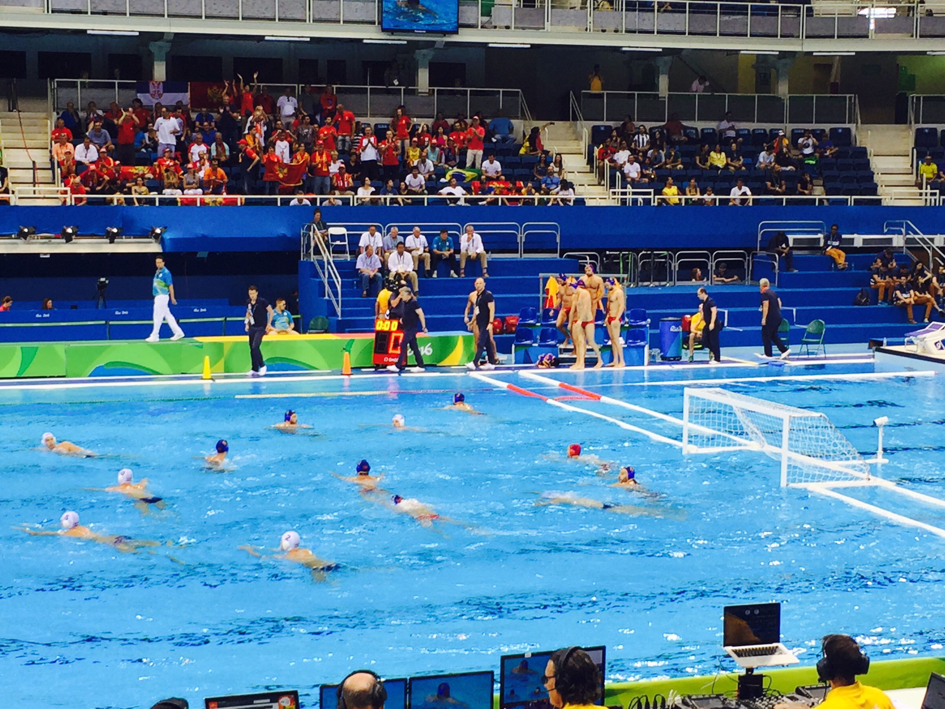 5. Event Action: This morning, Kendell Haynes and I attended the water polo quarterfinals action between Hungary and Montenegro and then Spain and Serbia. After walking all the way to the Maria Lenk Aquatic Center because that’s what it said on our tickets, we were told that the water polo matches had all been moved to the main swimming stadium, another 15 minute walk away. We sat in the main Hungarian cheering section – loved that many of them were wearing Hun-believable t-shirts distributed by a travel agency there. Pretty sure all of the Montenegro fans in Rio were at that match. Montenegro won in a shootout after Hungary tied it with one min left. Serbia beat Spain to advance. Water polo was pretty thrilling to watch but I could see that there was a lot of battering and bruising under the water.