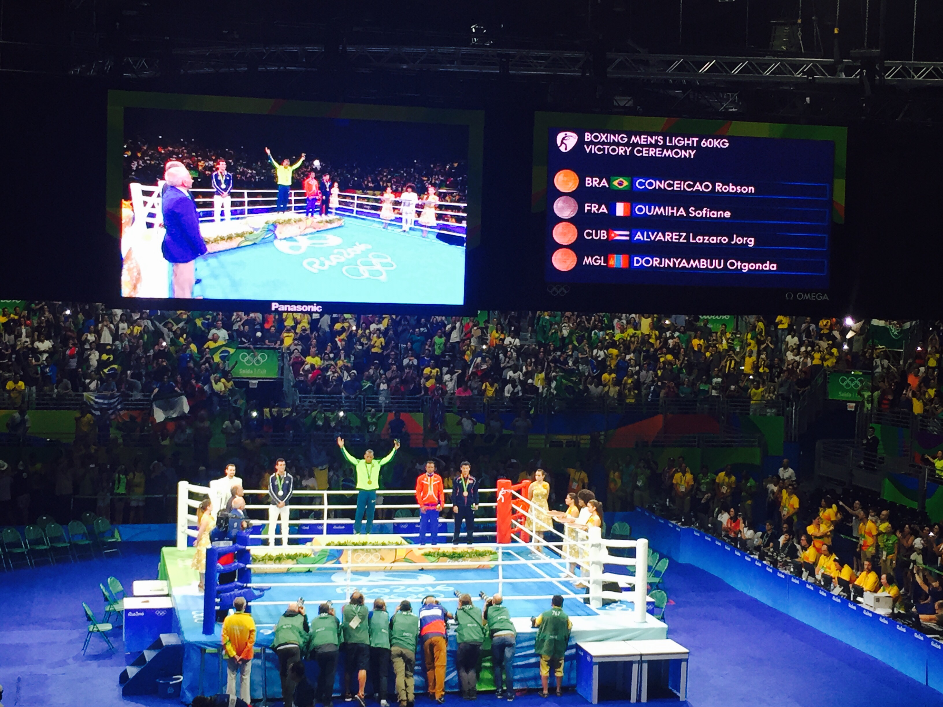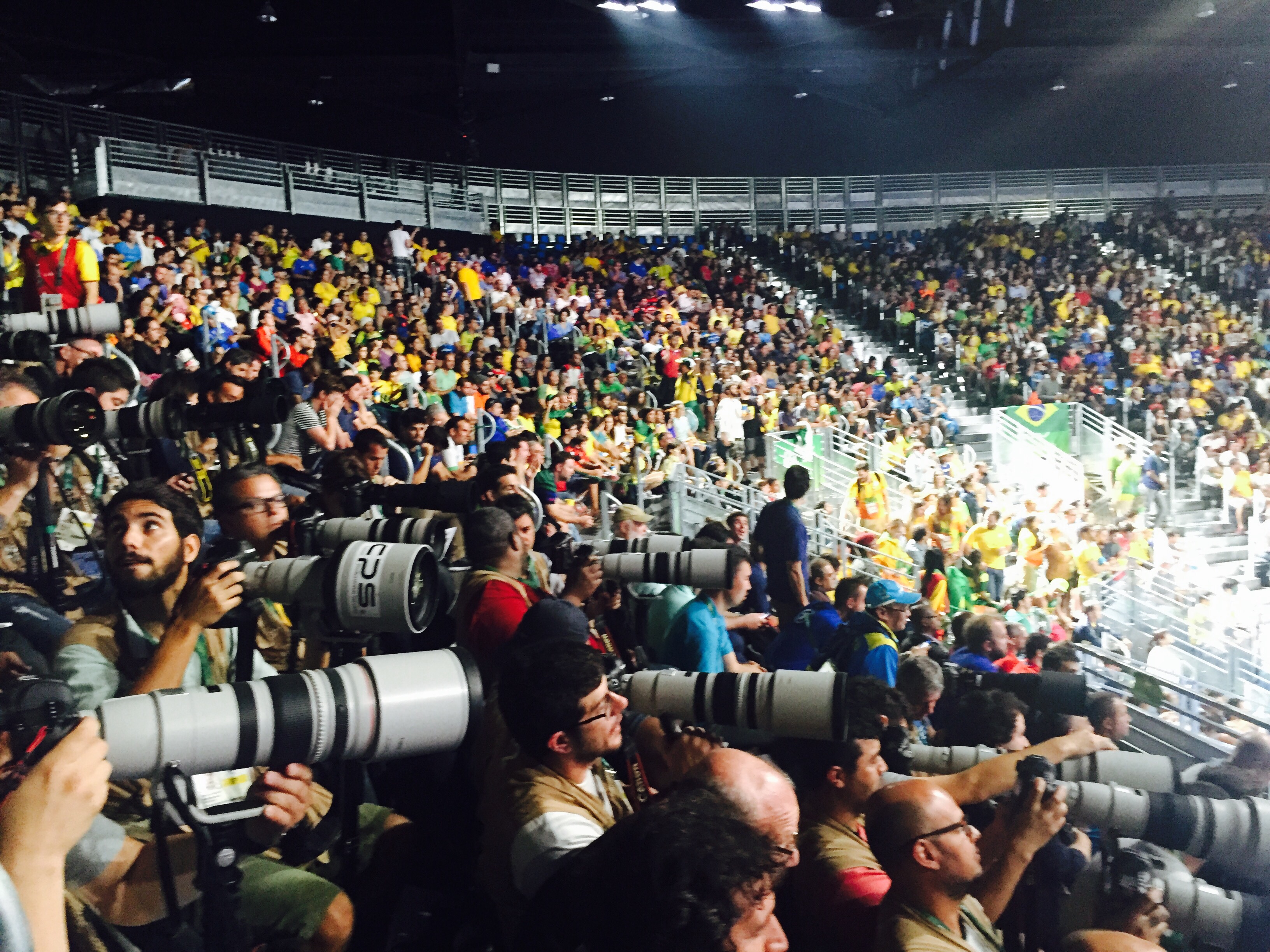 1. Boxing Fun: Yesterday I was busy directing photographers where to go and then escorted the heavyweight medalists through the mixed zone interview area and then into the press conference room. In between, I held the microphone for coaches during interviews. The Russian, Tischenko, defeated the Kazak boxer in a very controversial decision. I didn’t see the fight but everyone else was shocked. The whole arena boo-ed when the Russian was awarded his gold medal (terrible sportsmanship). His talented Russian volunteer interpreter explained that Tischenko was really stressed and felt bad about the result, that he was worried about everyone’s reaction and he couldn’t celebrate winning. The press kept asking him, “Do you think it’s fair that you won?” Every time, he would reply, “Well, I just said this, but if they declared me the winner, they must have had a reason.” I felt bad for him and later said congrats, gave him a thumbs-up, and handed him an American flag pin. Today we had the 60 kg men’s gold medal bout between France and Brazil. The Brazilian boxer, Robson, won Brazil’s first-ever boxing gold and the sold out arena went crazy. Afterwards, I was helping to escort boxers again. The third place Cuban boxer, Alvarez peaced out, refusing to stay for the press conference despite my attempts to get him to sit still. Robson was brilliant, likeable, and charming for the press. Very cool to see him win in person!