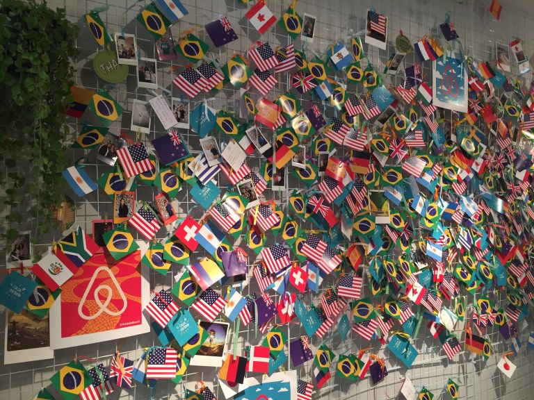 Airbnb House: As I booked an Airbnb prior to the Olympics in Rio, I was contacted about visiting the Airbnb House in the Ipanema Beach area. While it was on the smaller side, it featured impeccable interior design. We later found out that the building usually serves as an art gallery. We were lucky as there weren’t many people there and got to chat with Airbnb employees from their main office in Sao Paulo. We were served free typical Brazilian beach snacks and local craft beer from Rio. There were also TVs showing some of the soccer matches. In the back, there was a large bulletin board with flag tags for guest to grab and stick on a map in the spot where they’re from. All you had to do was write your favorite place in Rio on the tag. Another great thing Airbnb did was give out their own version of the Salvador Bahia wish bracelets from the Bon Fim Church. Again, such a great place to relax! I especially liked the outdoor patio and enjoyed talking with the Airbnb folks.