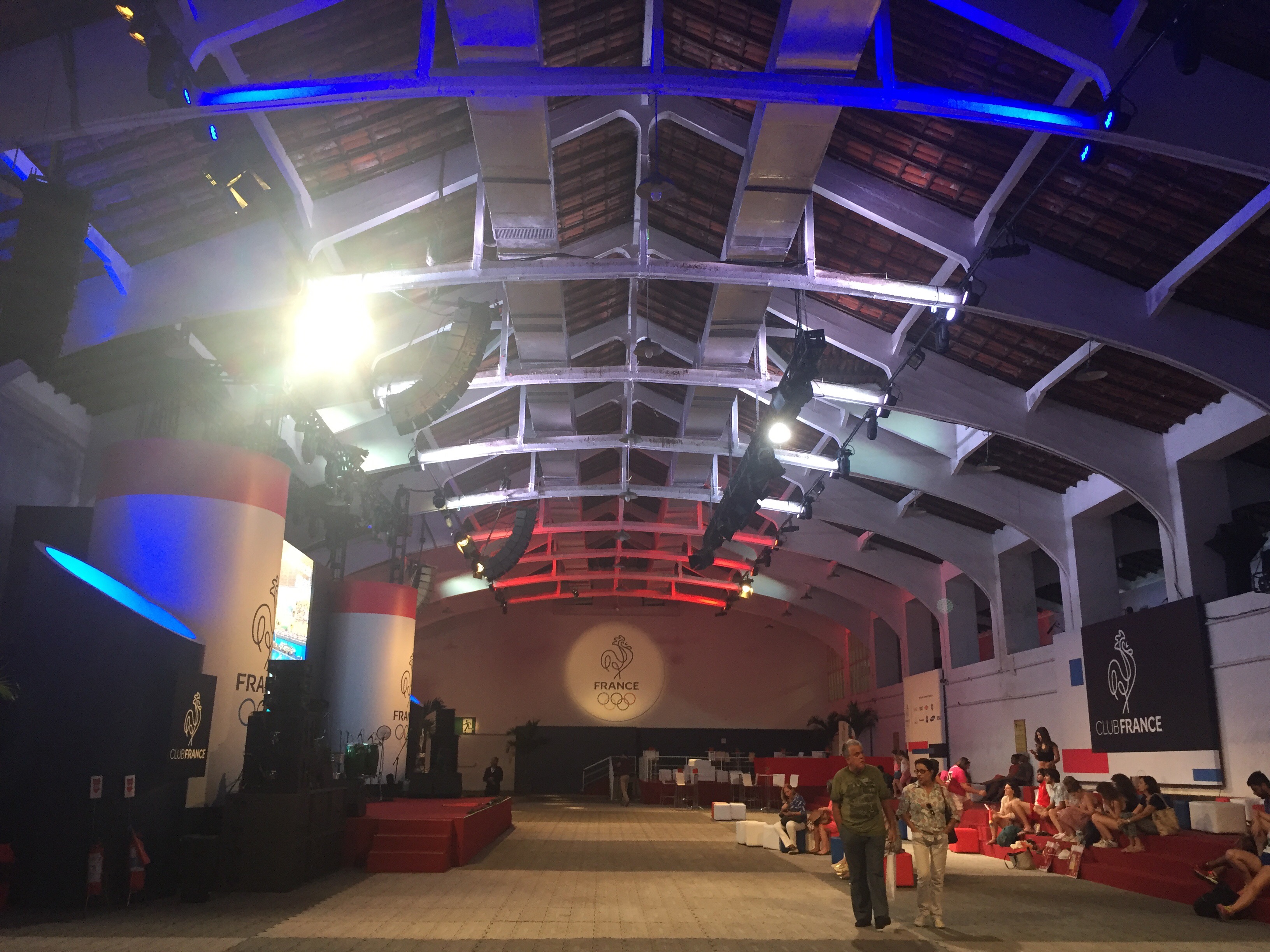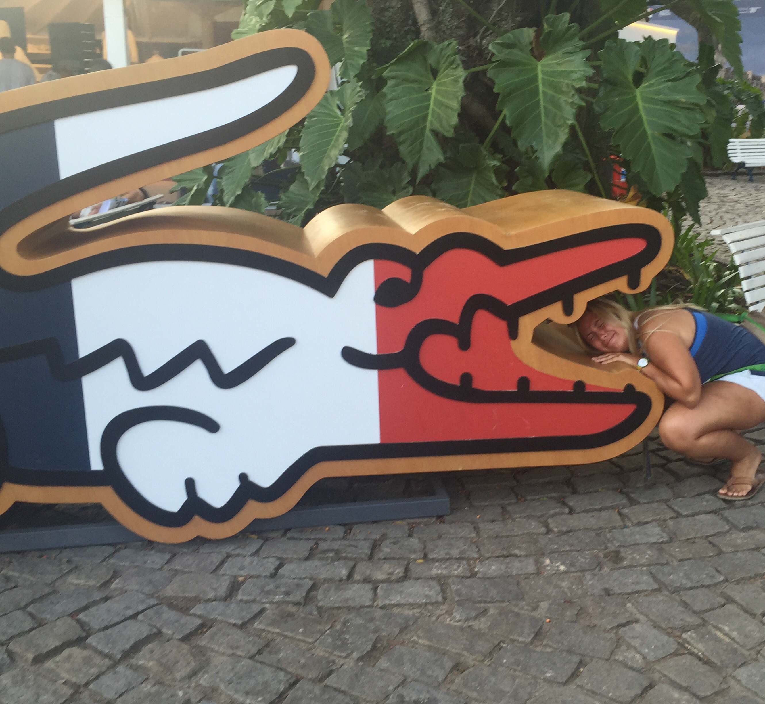 French House: “Club France” wasn’t too far from the previous two houses but getting there took longer than expected when our Uber got stuck in some nasty traffic. We’d heard that volunteers could get in for free if we just showed our credentials. We did just that and walked right in late in the afternoon. Like the Canada House and Holland Heineken House, Club France was based at a local community center/country club. There was a big area for kids to try out mini versions of Olympic sports like shooting. Many of the sponsors and other French companies also had kiosks and booths. We liked the very fancy Lacoste store with the huge red, white, and blue Lacoste logo gator out front – at least we had fun posing! One warehouse had tons of food stalls featuring delectable French treats like crepes. Another warehouse housed the nightclub at the back (famous for where Ryan Lochte came from that night) and then had a big TV showing French sports events towards the front. The enclosed area itself was fairly huge.